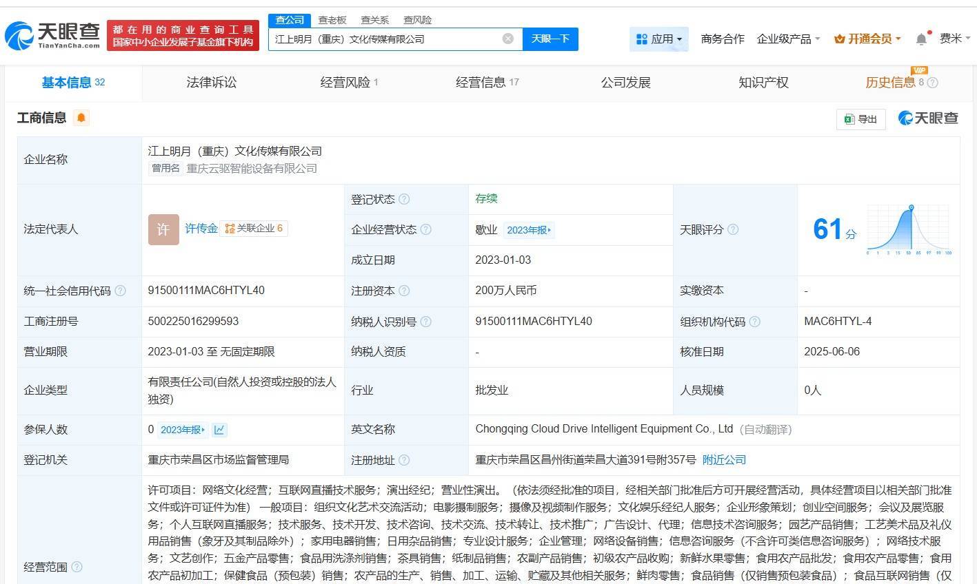 天眼查经营风险信息显示,近日,江上明月(重庆)文化传媒有限公司因未依照规定的期限公示年度报告十倍配资开户,被重庆市荣昌区市场监督管理局列入经营异常名录。