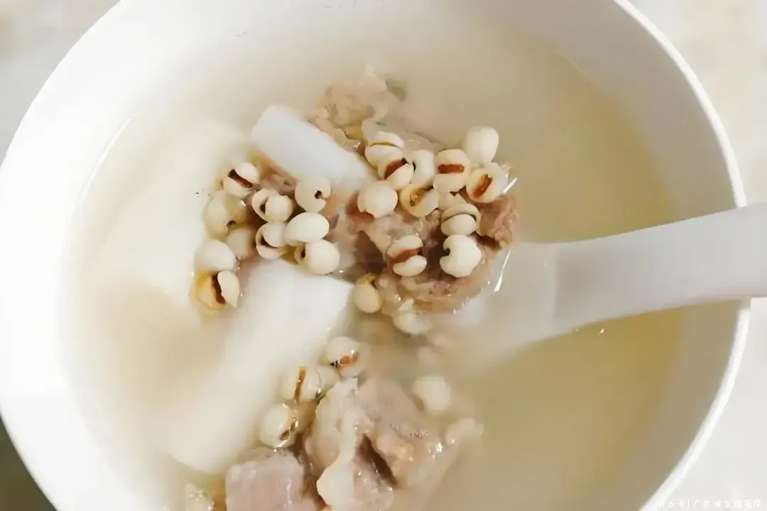 薏米山药瘦肉汤:薏米50g,山药15g,茯苓10g,白扁豆10g,陈皮3g,瘦肉400g,生姜3片。煲2小时,调味食用。